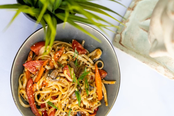 Паста Фетучини, Курица, Шампиньоны, Сливки, Черри, Базилик, Пармезан.