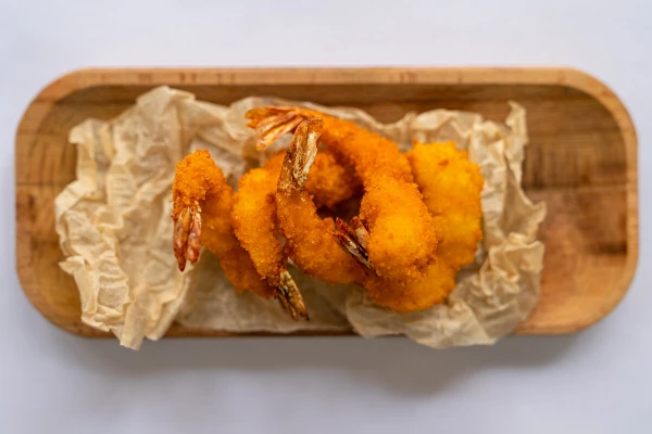 Тигровая креветка в кляре подаются с соусом сливочный чили.