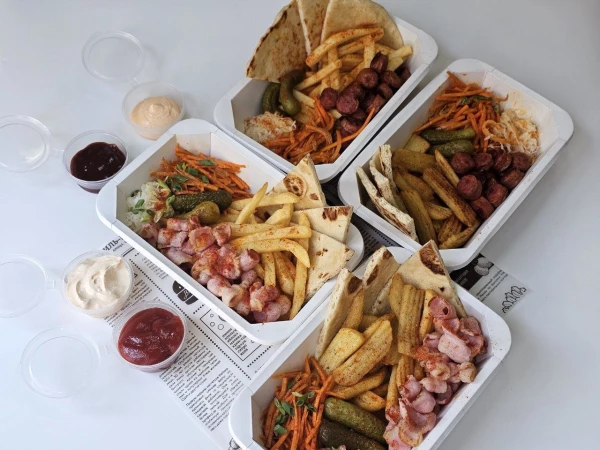 Картофель фри 2 шт., Луковые кольца 1 шт., Кольца кальмара 1 шт., Наггетсы 1 шт., Стрипсы 1 шт., Сырные палочки 1 шт., соус сырный , соус барбекю.