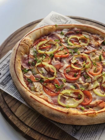 Моцарелла, Курица, Яичный желток, Помидор Черри, Сливочное масло, Соус Цезарь, Пармезан.